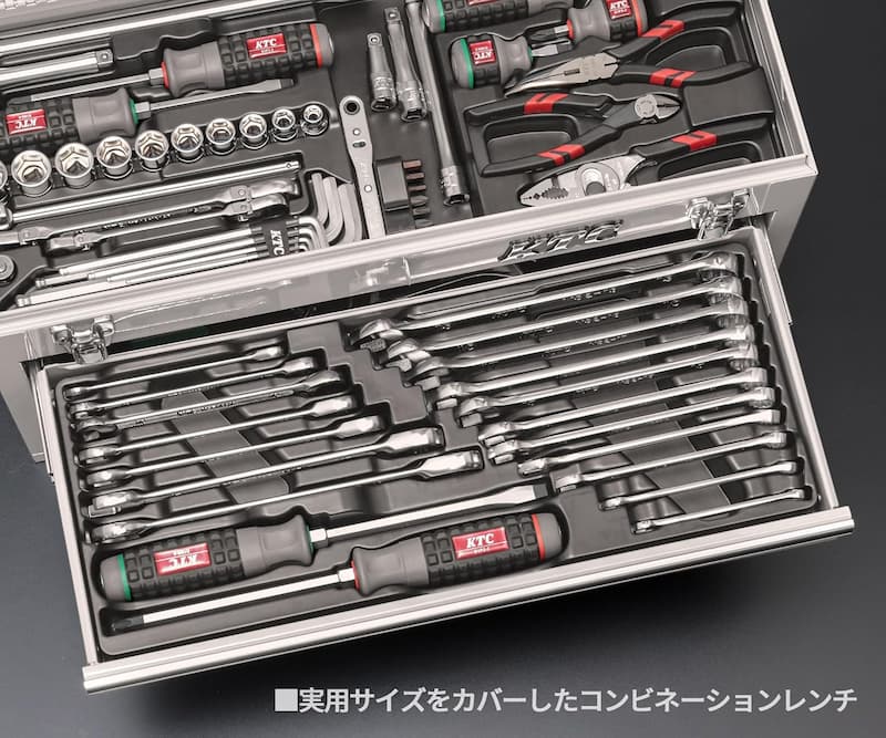 必要なソケットやレンチが幅広く含まれていて、自動車から機械整備まで幅広く対応可能。