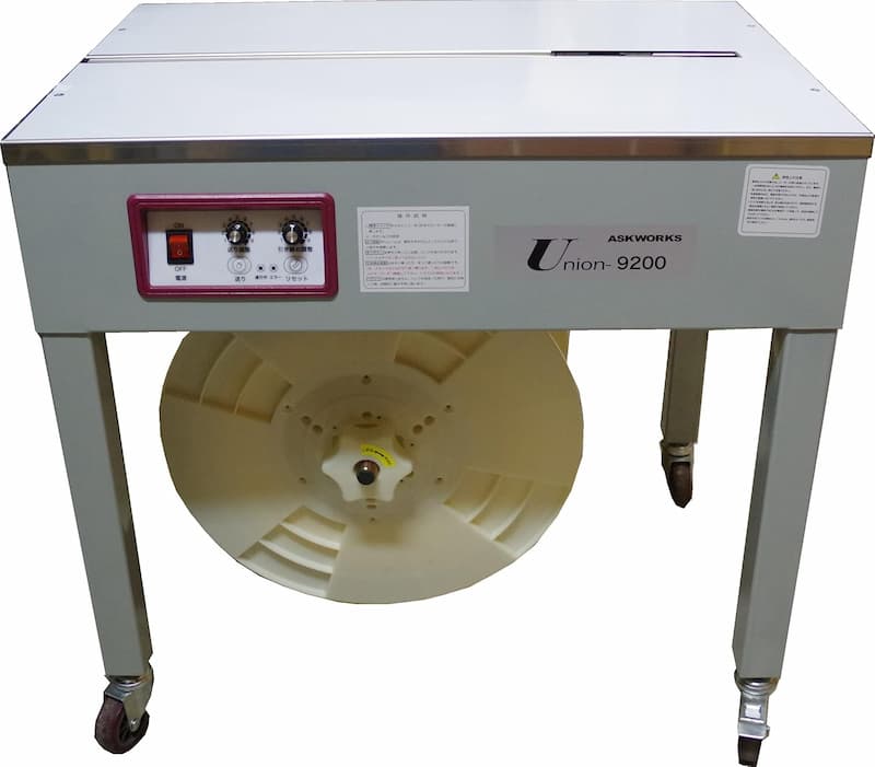 アスクワークスのUNION-9200は、誰でも扱いやすいシンプル構造が魅力の半自動梱包機。