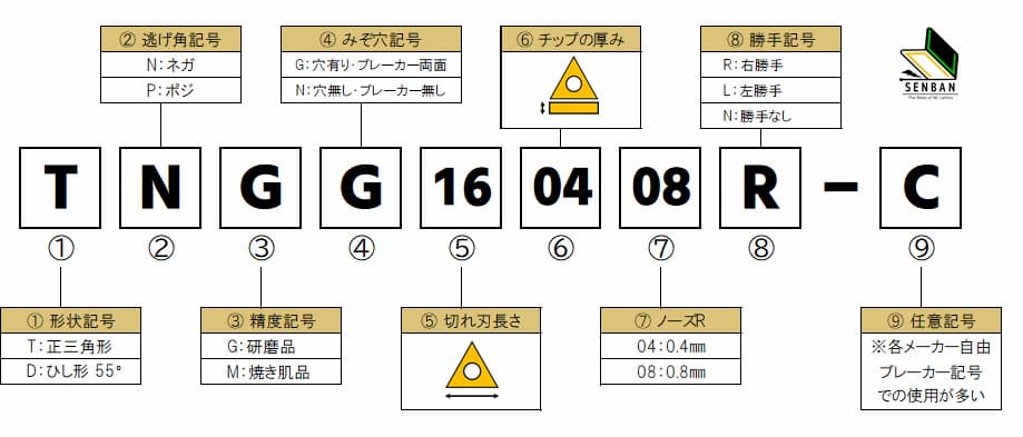 スローアウェイチップには「TNMG160408」などの型番があります。