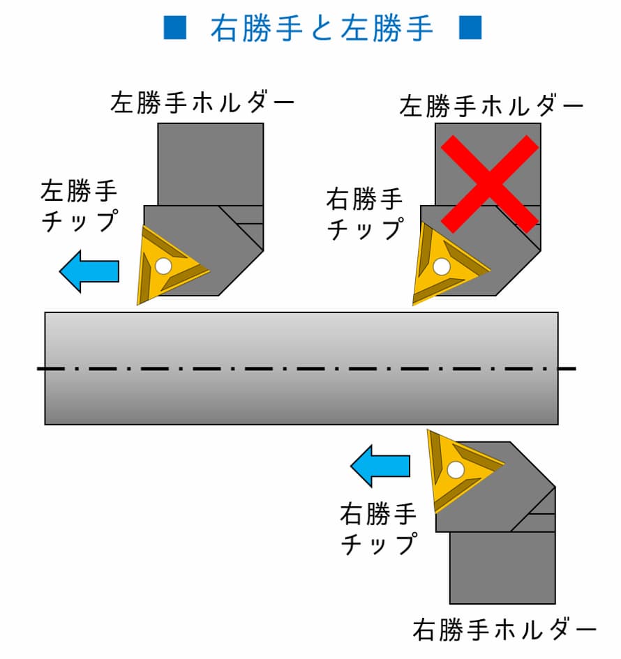 これは、バイトホルダーと組み合わせたときの加工方向(ワークへの当て方)によって決まります。