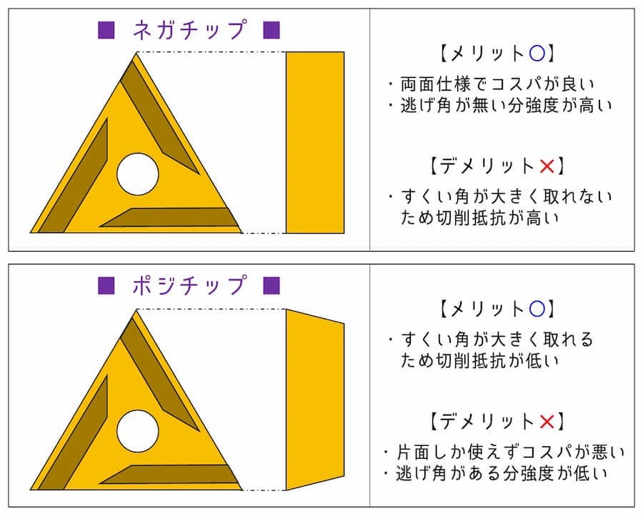 スローアウェイチップを選ぶ上で特に重要なのが、「ネガ」「ポジ」の違い。
