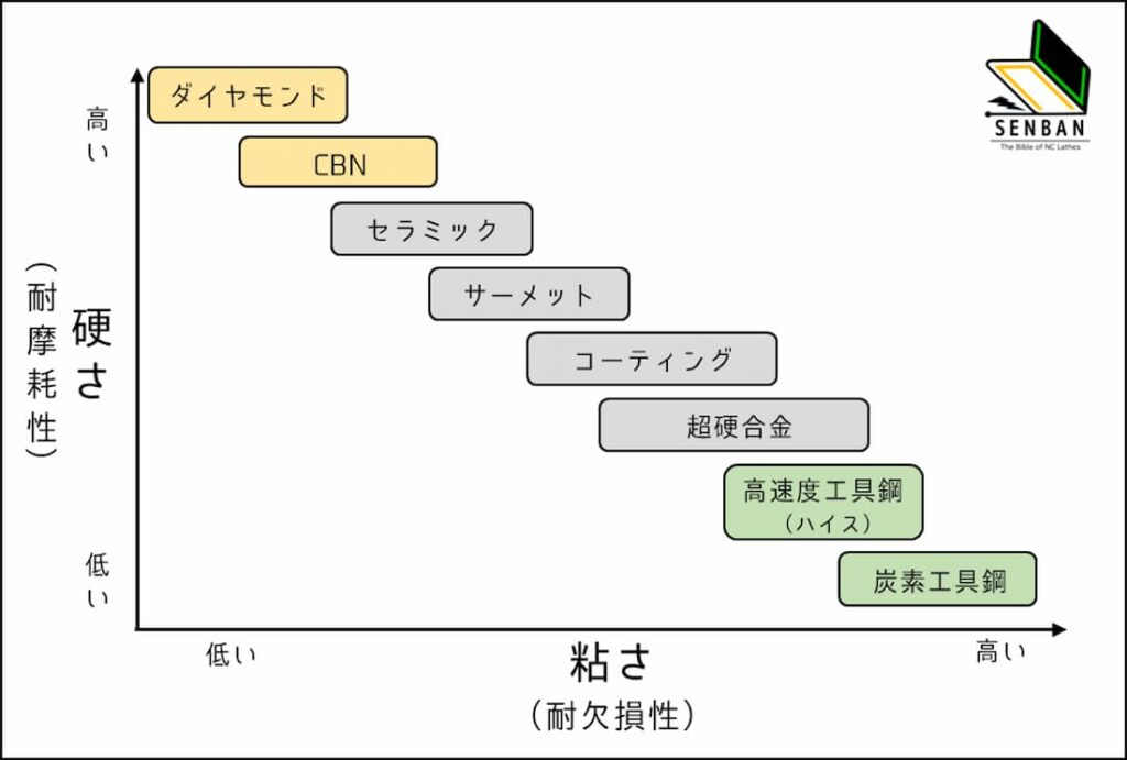 | 材質 | 特徴 | 適した加工 | 耐熱性 | 耐摩耗性 | 粘さ (靭性) | 主な適用素材 |