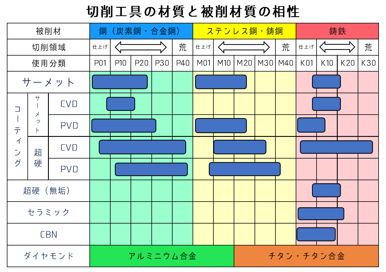 「切削速度」「送り」「切り込み量」などに応じて、材質ごとに向き不向きがあります。