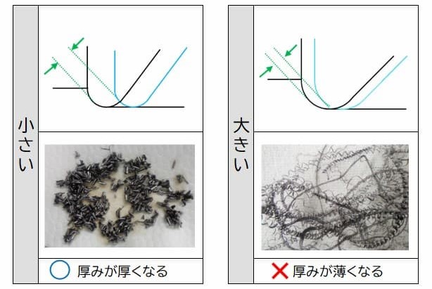 工具のコーナーRが大きいと、広い範囲を切削するため、切粉の幅が広くなります。