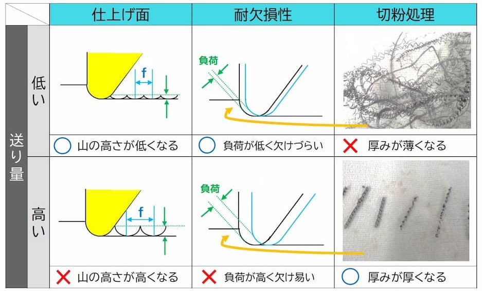 また、送りの上昇は切削抵抗の増加にもつながるため、工具剛性や加工機の負荷には注意が必要。