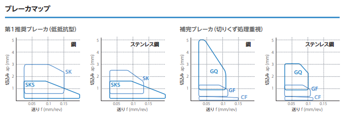 とくに粘りのある被削材では、深めの溝形状や切粉押さえが強いタイプが有効なことが多いです。